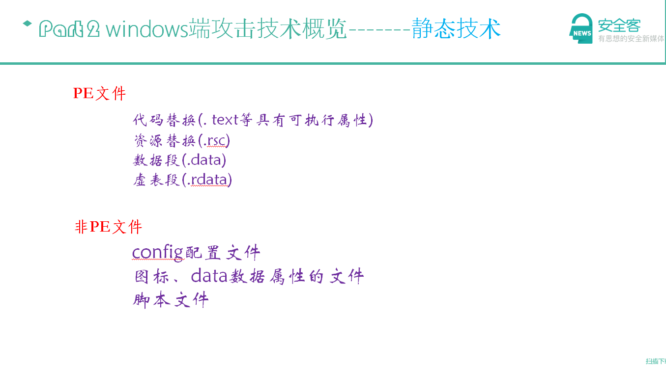 静态攻击技术一般直接修改可执行文件内的代码、数据或者资源或者可执行文件的调用的一些配置文件或者脚本文件,比如有些恶意文件在躲避杀毒软件的免杀时通常会找到一个白名单进程,而替换白名单的配置文件去躲避检测的同时又被白名单进程加载运行真实的恶意代码。