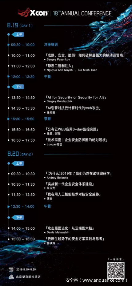 今年XCon将迎来它的第18年,对于安全技术的追求,XCon从来没有懈怠过,每次会议的提议都是经过组委会精挑细选的,在XCon上你将见识与学习到世界最前沿的安全技术。