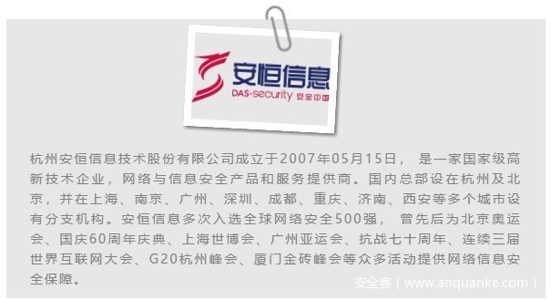 杭州安恒信息技术股份有限公司于2007年成立,一直专注于网络信息安全领域,主营业务为网络信息安全产品的研发、生产及销售,并为客户提供专业的网络信息安全服务。产品及服务涉及应用安全、大数据安全、云安全、物联网安全、工业控制安全及工业互联网安全等领域。