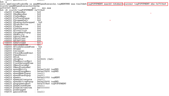 如下所示hMenuList[0]调用xxxTrackPopupMenuEx,对应的tagPOPOUPMENU弹出窗口对象为0xfe7034a8,此时fDesktroyed没有被设置。