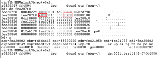 最终进入函数HMUnlockObject,可以看到第一个参数就是我在0x1c位置布置的hunt tagWnd+0x12.
