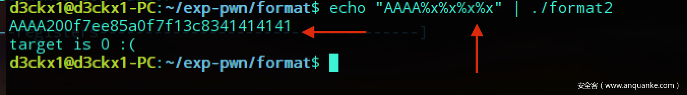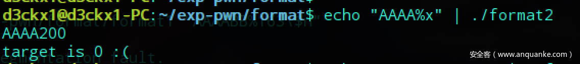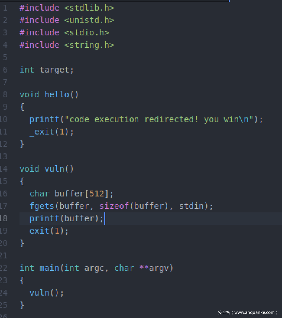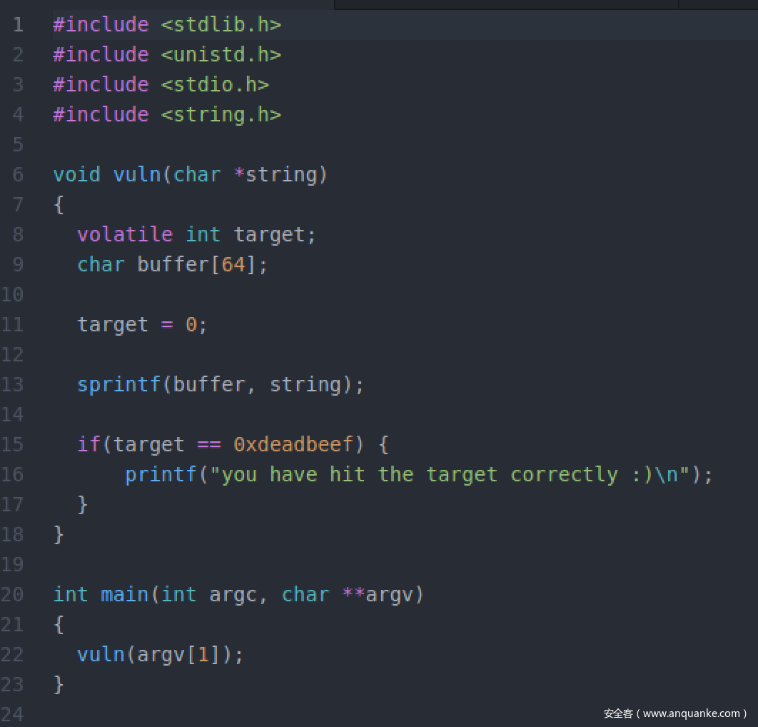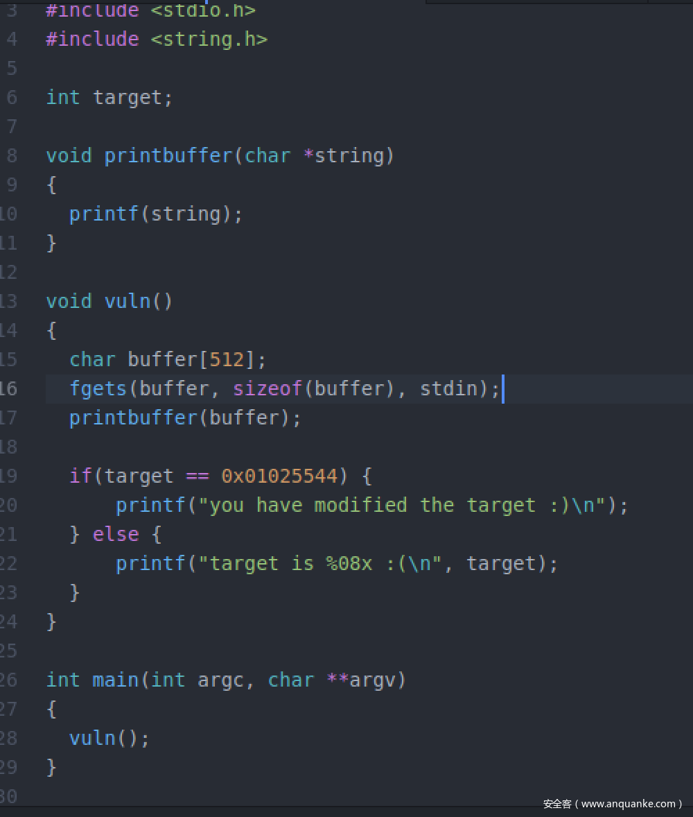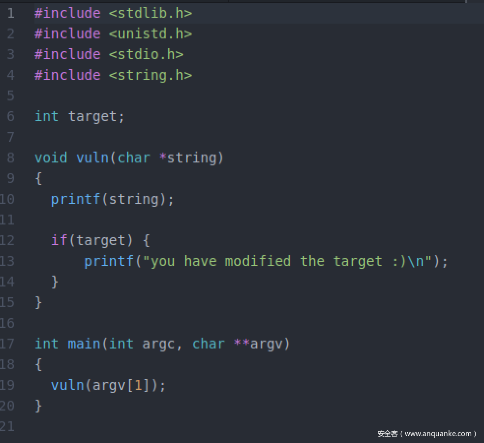 通过源码可以看到在13行代码处,是最典型的导致格式化漏洞的写法。