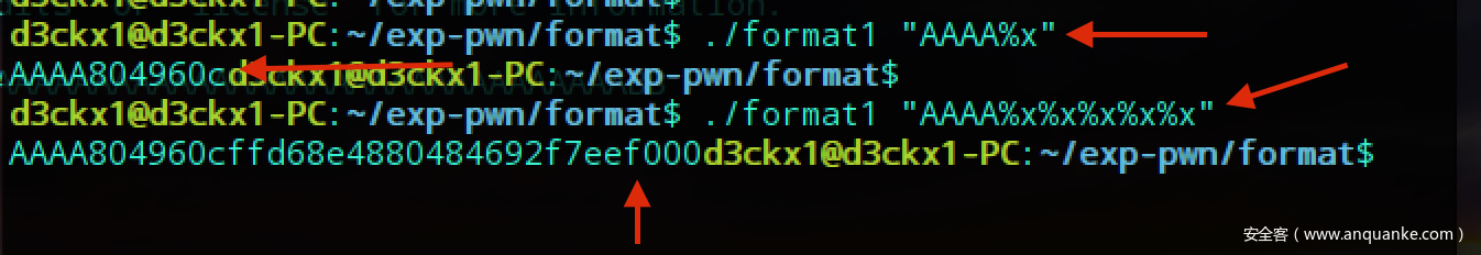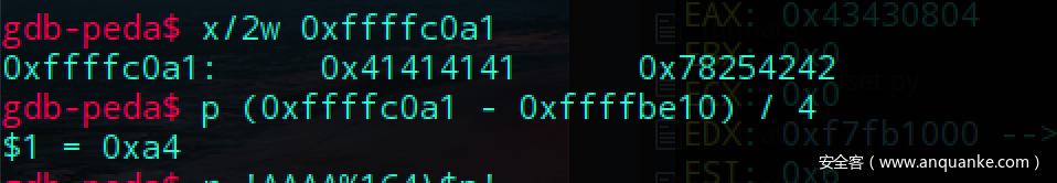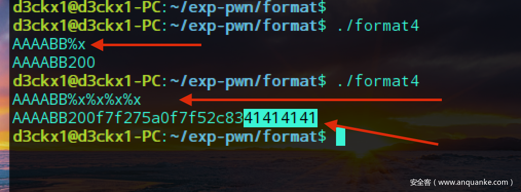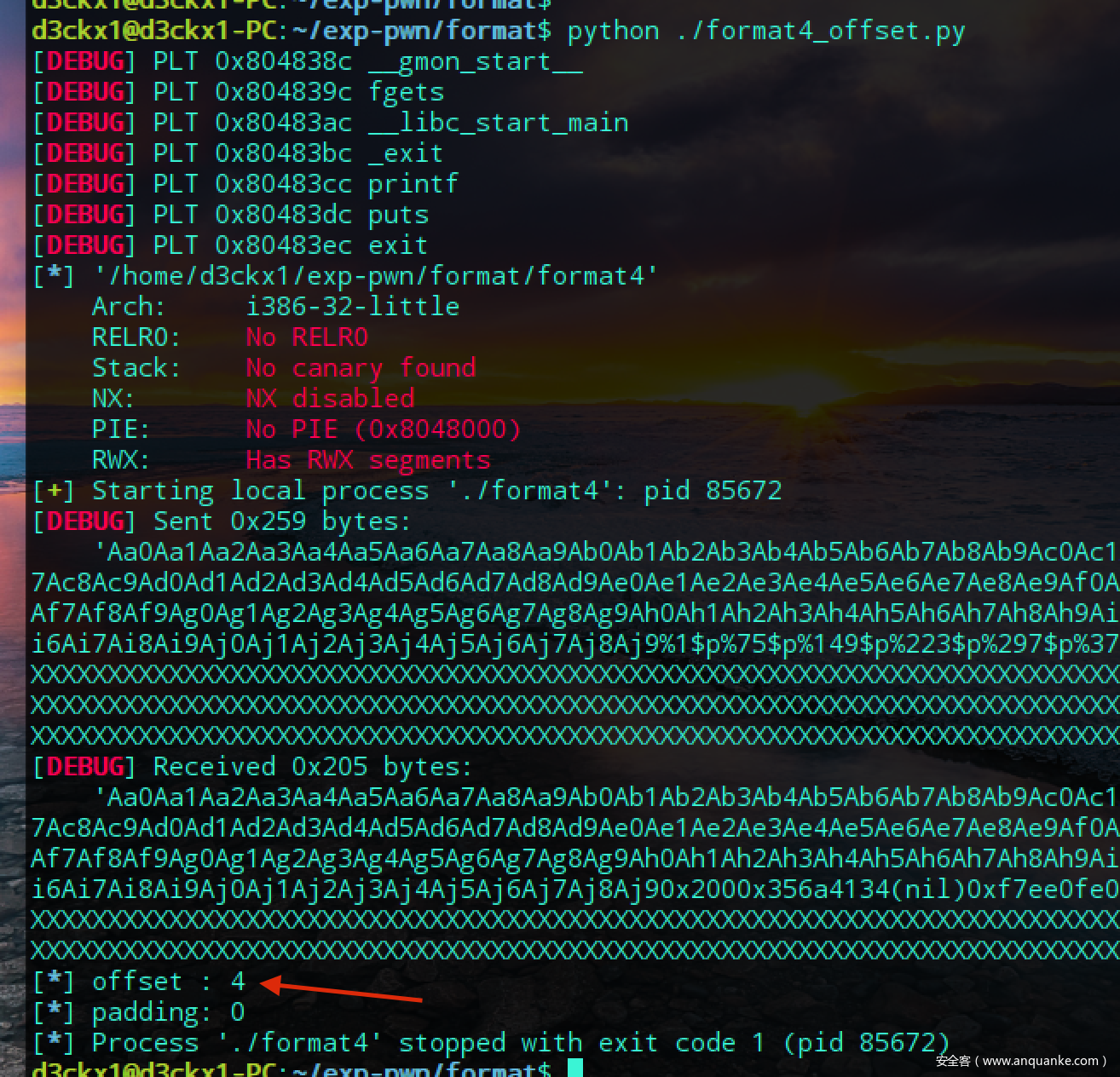 当我们输入“%x%x%x%x”时,然后就出现了“41414141”… 这说明该程序的偏移位为4,下面我们使用pwntools来验证一下,代码如下: