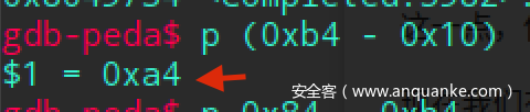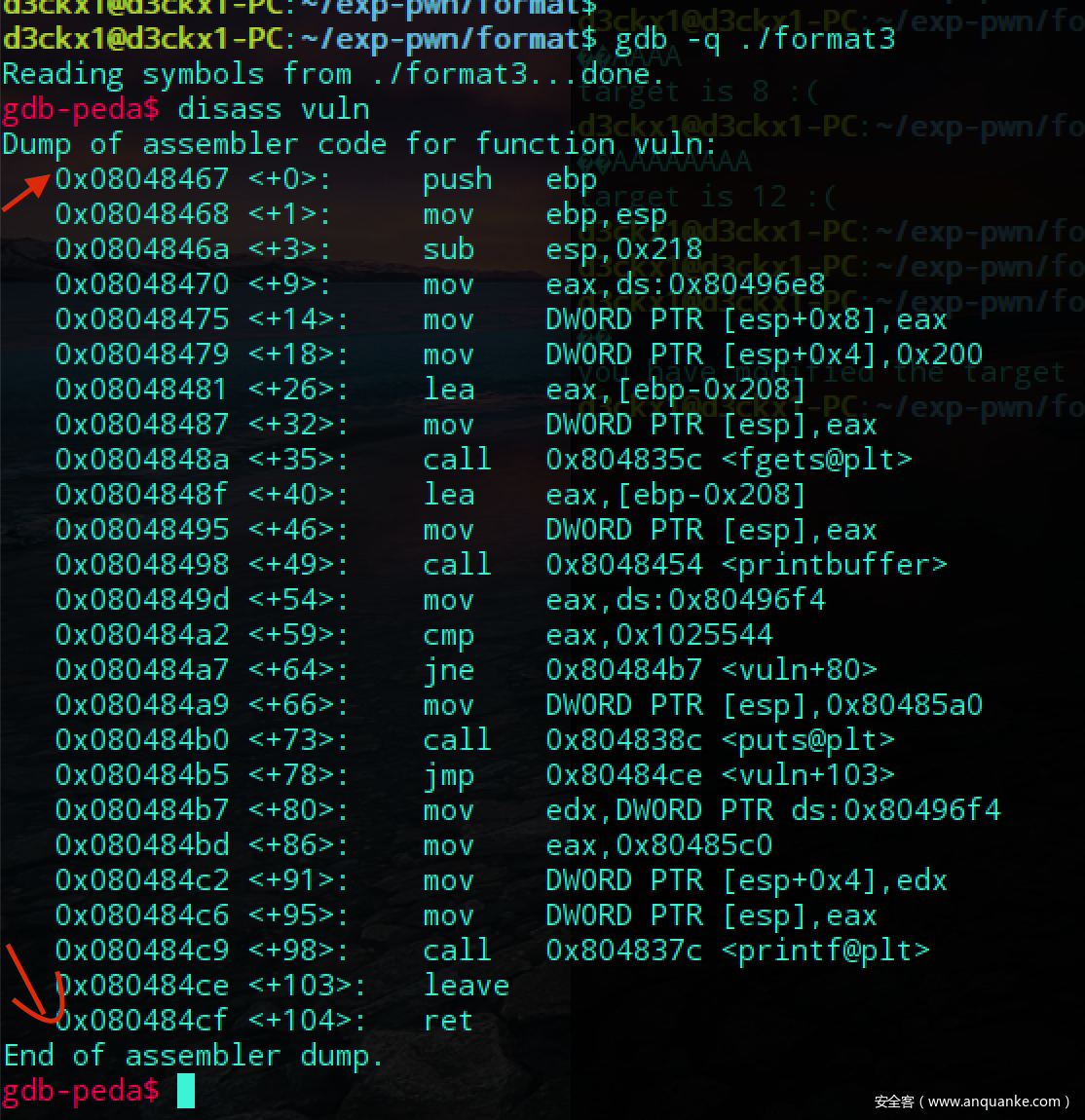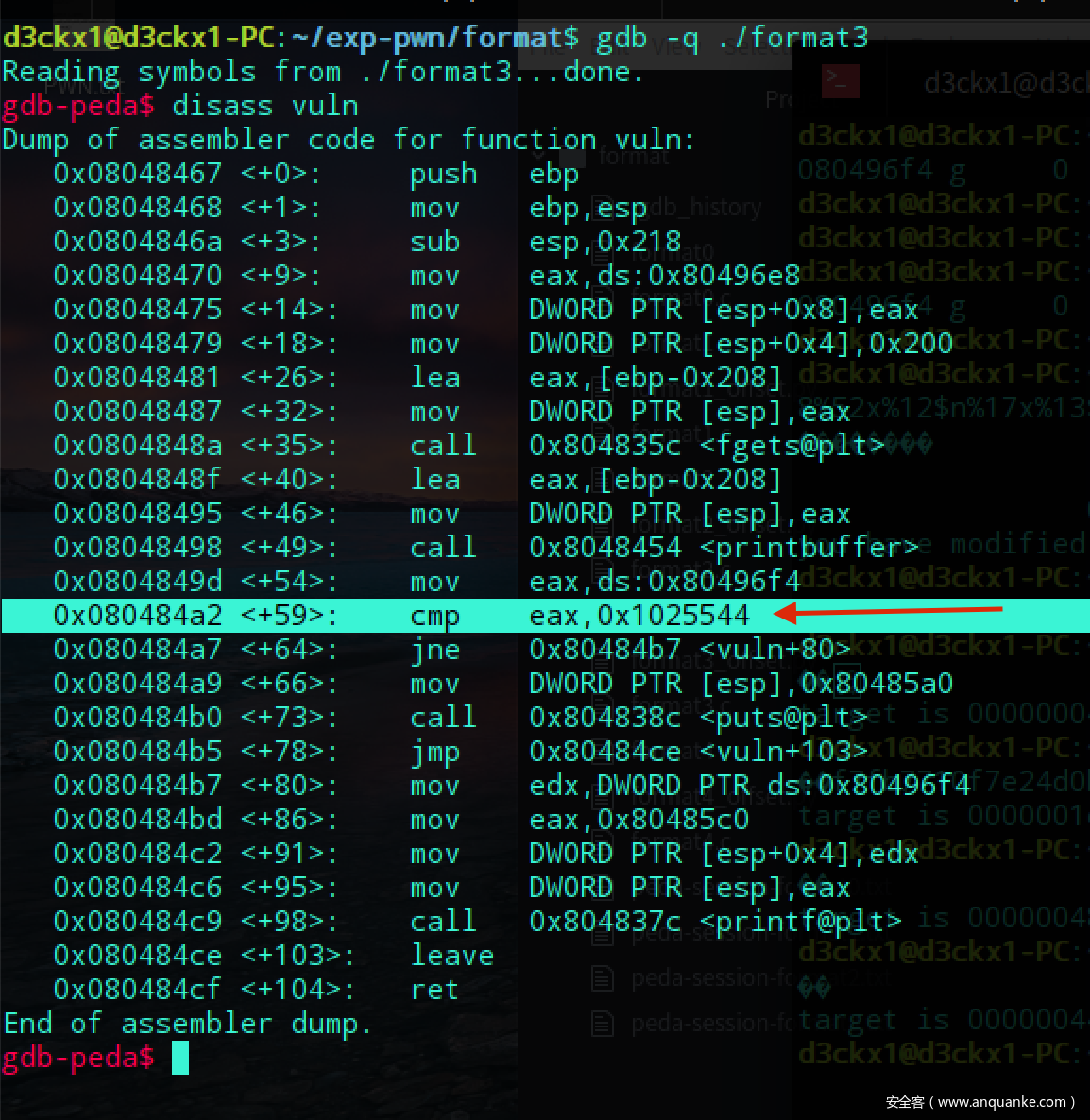 我们用gdb载入调试该程序,查看“vuln”,在如上图中可以发现,程序有个比较操作,地址“0x1025544”。那我们继续逐一构造吧,如图: