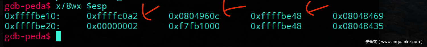 如上图,当我们输入一个“%x”时,程序给出了一个内存地址,当我输入5个“%x”时,程序也给出了5个内存地址,这就对了,下面我们看一下,这些地址是啥,