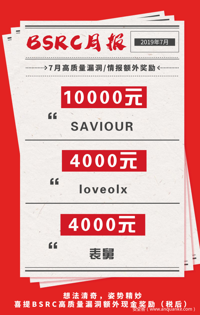 首先参加BSRC翻倍活动,一个严重,6倍奖励将获48000元现金奖励作为一个优秀团队的优秀成员,将获5000元额外奖励。一个高质量漏洞/情报,保守估计再获10000元额外奖励(对于符合 BSRC 优质漏洞奖励计划的高危安全问题,将在已得评分的基础上额外给予 1~5 万现金奖励 ,对于符合 BSRC 优质漏洞奖励计划的严重安全问题,将在已得评分的基础上额外给予 4~50 万现金奖励)