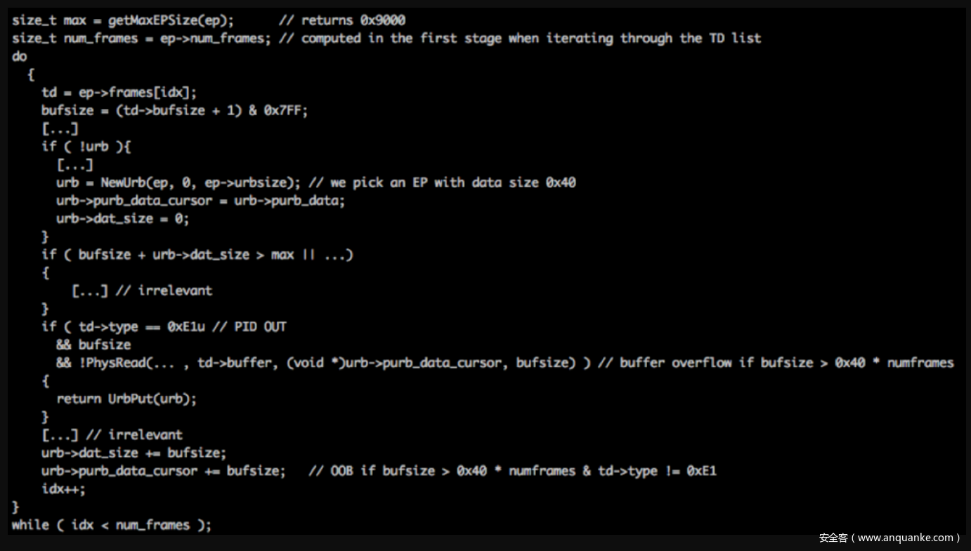 URB对象简述:英特尔UHCI规范提到的URB对象是USB中的一个请求块,研究发现,从NewUrb函数返回的对象是一个围绕有效规范USB请求块(URB)的包装器结构。检查TD的类型以及缓冲区大小后,如果TD类型是0xE1(USB_PID_OUT),那么TD缓冲区被复制到从中返回的对象内的缓冲区NewUrb函数。如果TD对象的类型不是0xE1,则它会传递缓冲区指针(在代码中引用purb_data_cursor)。