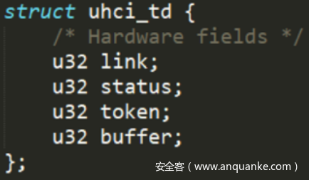 由uhci_hcd驱动程序处理的数据包由uhci_td(传输描述符)结构在内存中表示如下:
