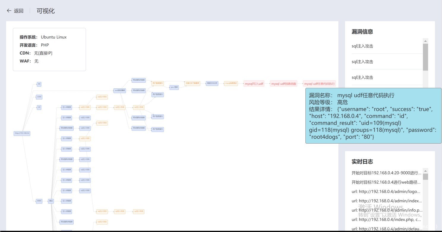 在DEMO中可以看到,系统在发现SQL注入后,触发了Sql注入攻击,获取库名-表名-字段名,直至拿到了管理员的账号和密码。而这些步骤,我们可以用if-else即可完成,那我们的优势在哪?下面就是联动功能了,在同时web路径爆破拿到管理后台登录地址后,系统自动用获得的账号密码自动完成登录,登录后再次触发后台爬虫,爬取到一个任意文件下载漏洞,通过include循环分析,得到了数据库链接文件conn.inc.php,进而交给敏感文件分析,从中得到了MySQL的链接账号密码。这时候又发现目标开放了3306端口,系统则自动通过获取到的账号密码登录3306端口,写入udf,创建函数,最终在服务端执行命令。回溯整个过程,系统不仅可以智能决策下一步该怎么走,又可以根据经验智能联动,将不同步骤的结果相互组合,最终达到“给我一个目标,还你一个shell”的效果。