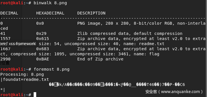 知道里面藏了一个zip压缩包。拖进kaili,用binwalk确认一下,然后用foremost讲压缩包分离出来。