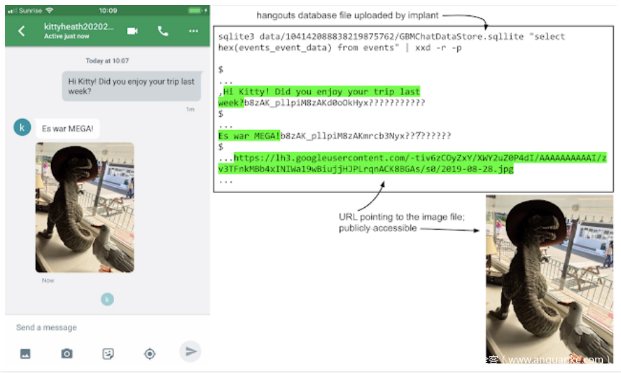 以下是Google Hangouts 在iOS中的对话以及上传的相应数据库文件。通过一些基本的SQL,我们可以轻松地看到消息的纯文本,甚至是共享图像的URL。