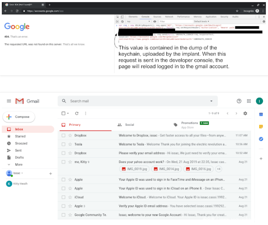 key串还包含Google的iOS单点登录等服务所使用的长期令牌,以使Google应用程序能够访问用户的帐户。这些内容将上传给攻击者,然后可用于维护对用户Google帐户的访问权限,即使植入代码不再运行也会继续上传。以下是使用用于在单独计算机上登录Gmail网络界面的可以串中存储为com.google.sso.optional.1.accessToken 的Google OAuth令牌的示例: