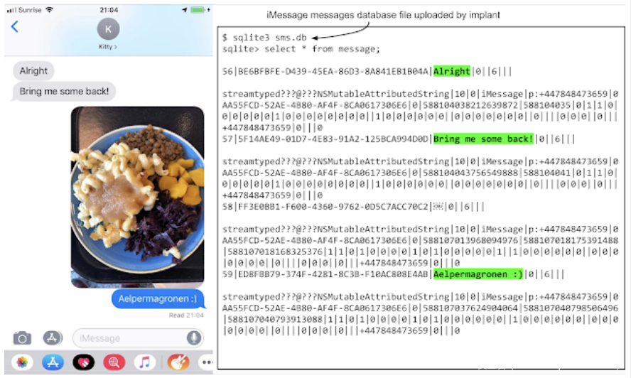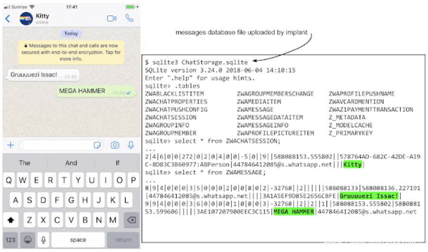 在深入研究代码之前,让我们看看运行注入代码的测试手机中的一些样本数据,并与我开发的自定义命令和控制服务器进行通信。为了清楚起见,我做了一个专门用于测试后演示植入代码可以做什么的设备。这个设备是运行iOS 12的iPhone 8. 植入代码可以访问端到端的加密应用程序(如Whatsapp,Telegram和iMessage)使用的所有数据库文件(在受害者的手机上)。左侧是应用程序的屏幕截图,右侧是植入代码窃取的数据库文件的内容,其中包含使用应用程序发送和接收的消息的未加密明文:
