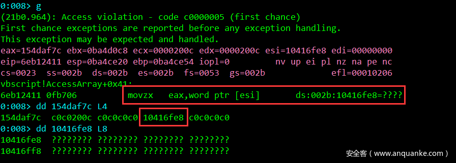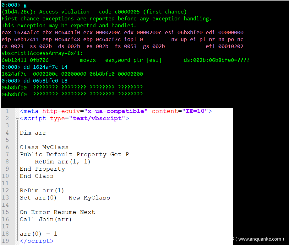 当浏览器将VbsJoin的返回值保存到arr(0)中时,PoC会在vbscript!AccessArray中崩溃(如图3所示),因为SafeArrayDescriptor已经被释放,但arr变量依然保存着指向已被释放的SafeArrayDescriptor的指针。