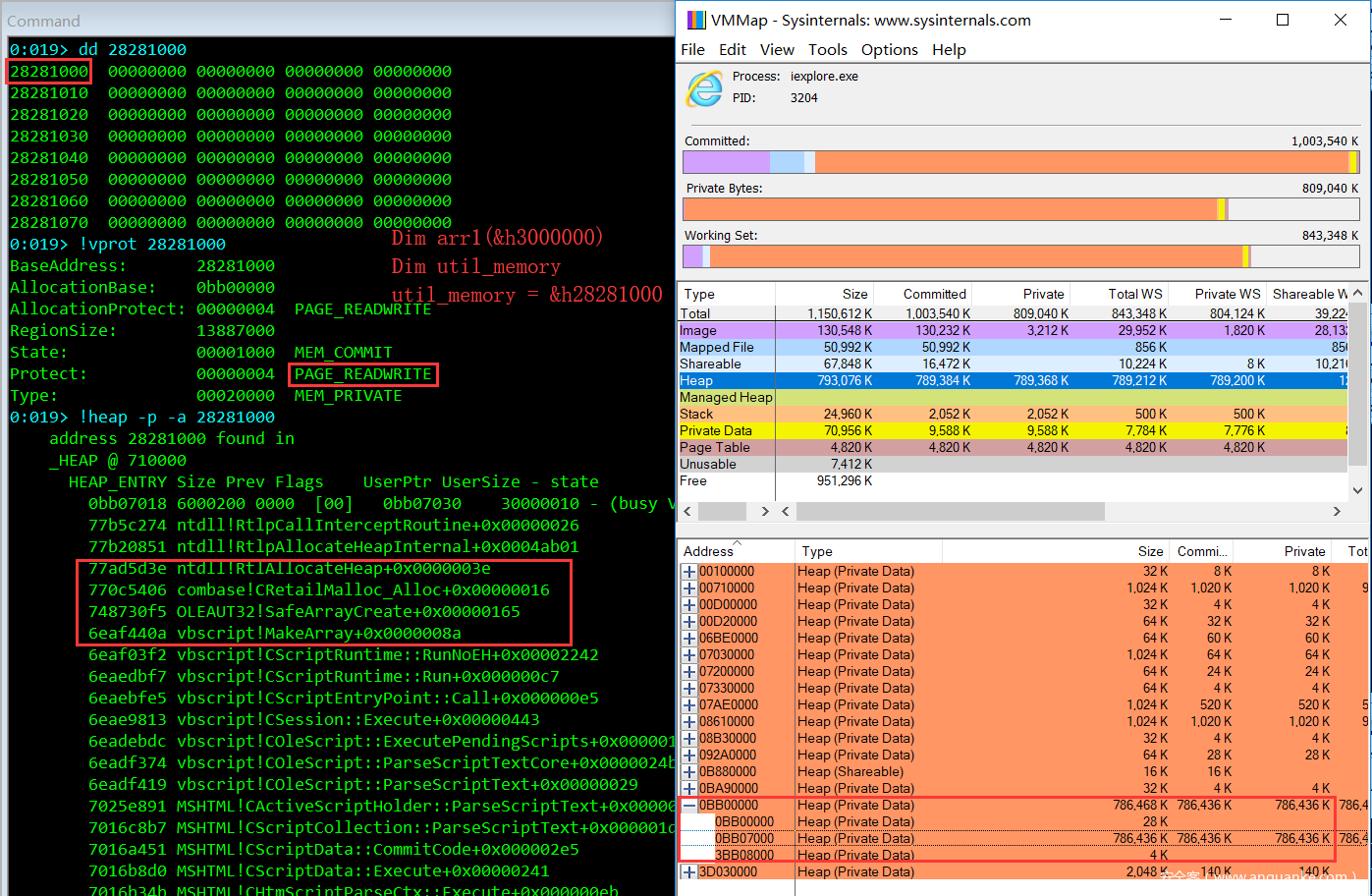 我成功伪造了一个SafeArray,可以用来读写从0x00000000到0x7fffffff的内存空间。为了泄露一些读/写地址,便于漏洞利用,我借鉴了Zuckerbraun之前的研究成果,使用堆喷射来获取一些固定的读/写地址(0x28281000,如图5下所示)。