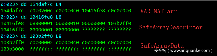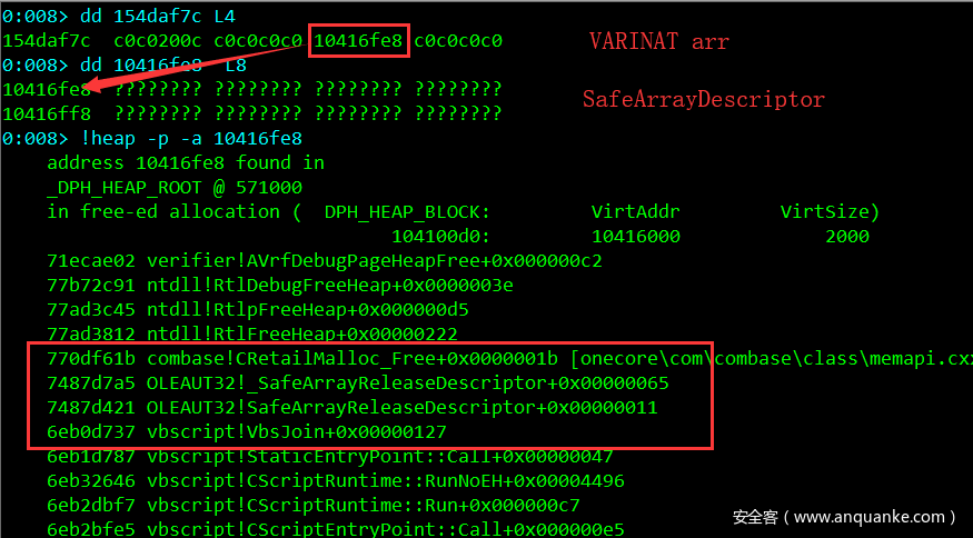 3、arr(0) = Join(arr):当从Public Default Property Get回调函数返回后,VbsJoin的代码执行流将调用SafeArrayReleaseData以及SafeArrayReleaseDescriptor来减少SafeArrayData以及SafeArrayDescriptor的引用计数。然而,新的SafeArray不受SafeArrayAddRef保护,且SafeArrayData以及SafeArrayDescriptor的引用计数为0。因此,新的SafeArray的SafeArrayData以及SafeArrayDescriptor会在SafeArrayReleaseData以及SafeArrayReleaseDescriptor函数中释放,如图2所示。