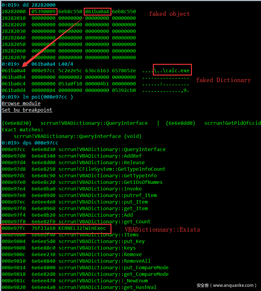 1、使用读/写内存函数来读取原始的Dictionary内存,将对应的数据保存到一个BSTR中,然后将VBADictionary::Exists替换为kernel32!Winexec;