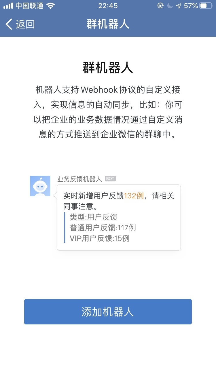 - 点击群聊右上角,然后找到 ‘群机器人’,然后点击’添加’