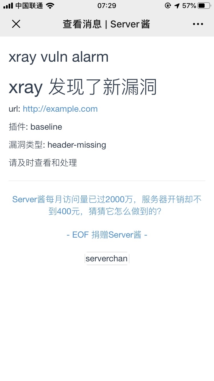 本文就借助 Server酱 和企业微信机器人,来演示如何实时通知 xray 发现了漏洞。