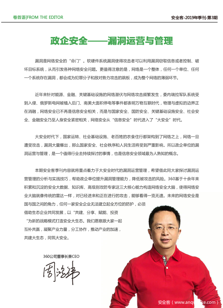 漏洞是网络安全的“命门”。软硬件系统漏洞使得攻击者可以利用漏洞窃取信息或者控制、破坏目标系统,从而引发各种网络安全问题。大安全时代下,国家运转、社会基础设施、老百姓的衣食住行都架构到了网络之上,网络一旦遭受攻击,漏洞大量爆出,那么国家安全、社会秩序和人民生活将受到严重影响 。本次季刊的主题即是以政企安全一漏洞运营与管理为主题,与大家一起共同探讨政企安全下的漏洞运营管理问题。