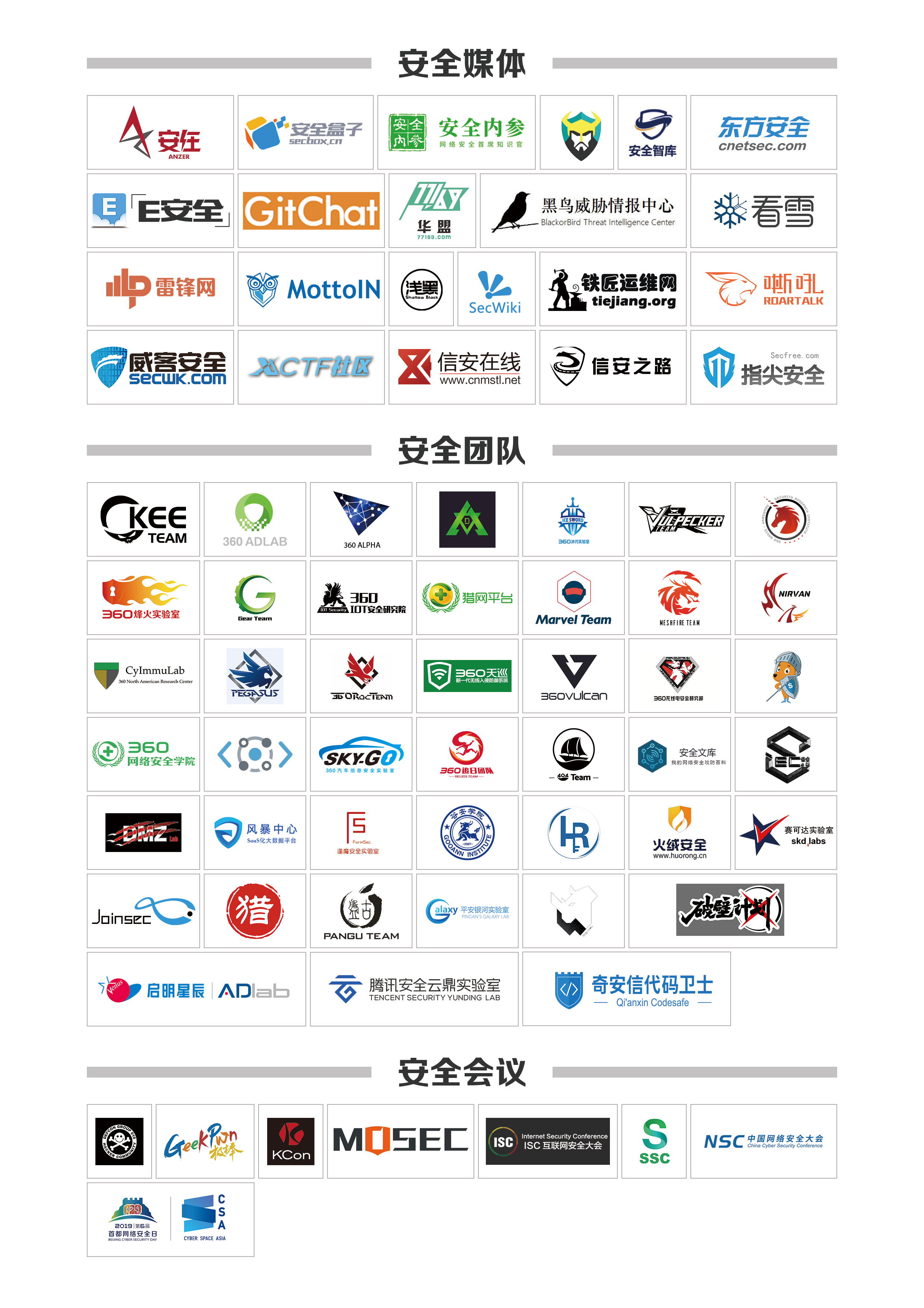 安全客在此向为本书的文章筛选、编辑及传播作出贡献的合作平台、合作公司、合作媒体、合作团队以及合作安全会议表示深深的感谢 !