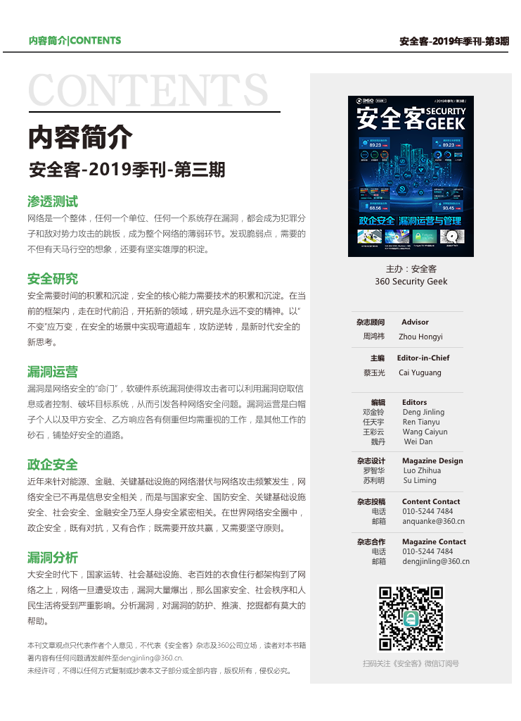 美团安全、阿里安全、奇安信威胁情报中心、先知社区、小米安全中心、天融信等15家安全团队的优质技术文章,才最终汇集而成安全客第三季季刊。