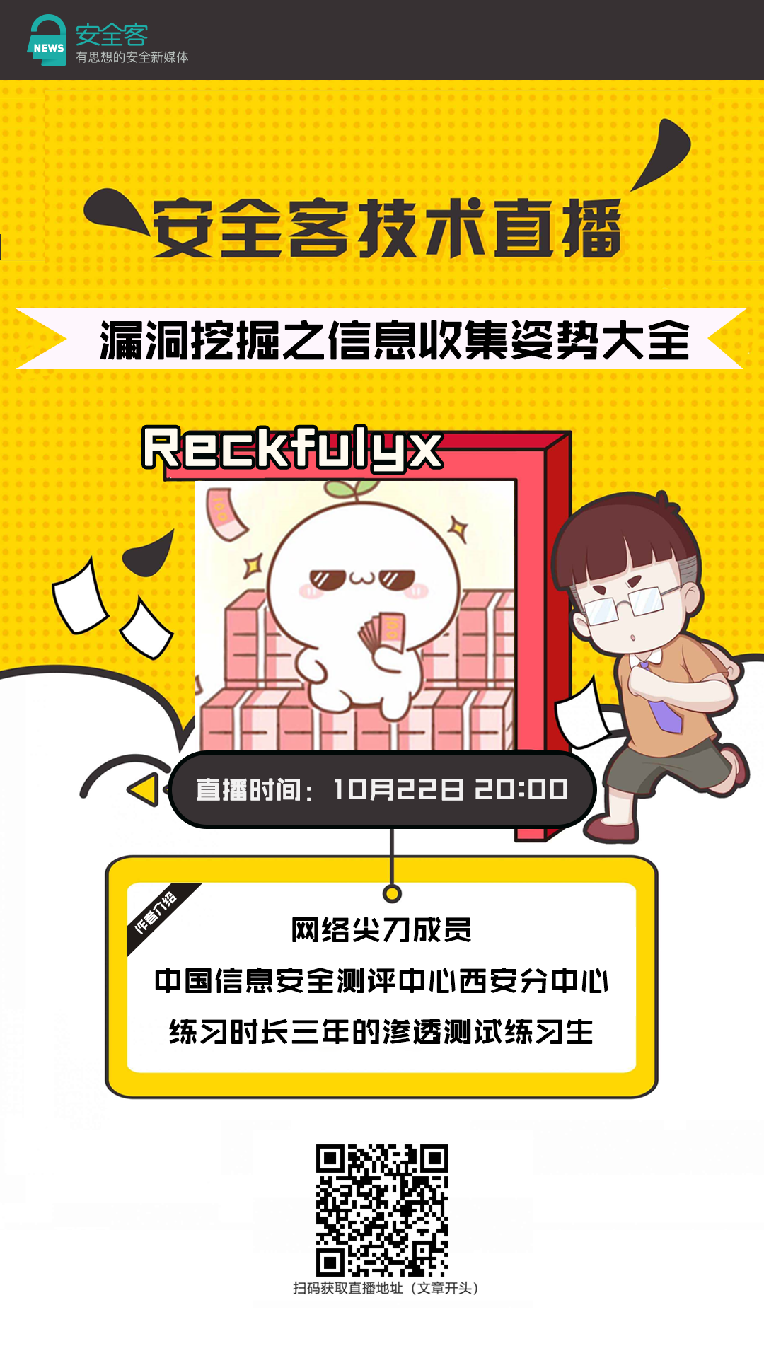 10月22日晚20:00,我们邀请到了安全客资深作者、网络尖刀团队成员、资深渗透测试工程师Reckfulyx为大家带来主题“漏洞挖掘之信息收集大全”,届时他将以漏洞挖掘中的信息收集方法技巧,从常规到进阶,由理论到实战为大家全方位介绍解读信息收集的各种实用知识。干货满满,不容错过!