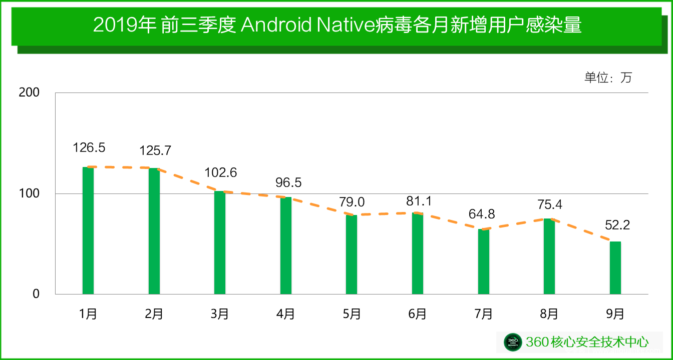 目前,360安全大脑发布《2019年Q3 Android Native病毒疫情报告》显示,Q3季度Android Native病毒感染量达192.4万,平均每天新增感染用户2.1万。虽然整体呈下降趋势,但以“伏地魔”为首的64位手机病毒来势汹汹,再加上近期谷歌连爆两枚高危漏洞被实际利用,Android Native病毒的防护依然不能掉以轻心。