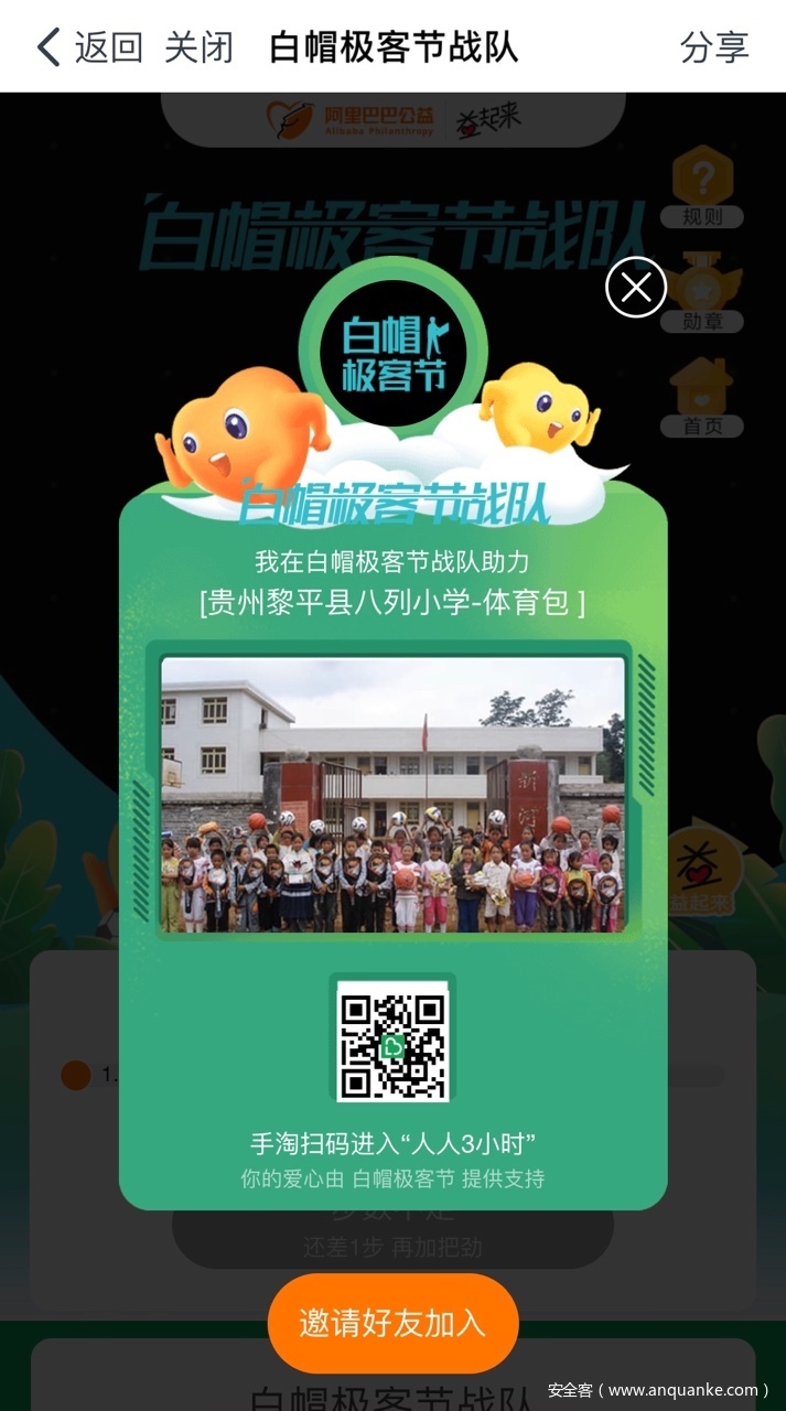 做好事行善举,人人都能参与的公益捐步小活动。打开手机淘宝扫描图片中的二维码,叫上家人朋友同学们一起来参加吧!A:在活动期间,向参与白帽极客节的任意一家SRC提交漏洞,即视为报名参加,做好事,行善举,欢迎叫上你的白帽小伙伴,一起加入我们的正义白帽微信群A:来来来,看这里,上一张白帽极客节公益形象大使Mat的祝福照片范本供你参考!Q:我想直接给贫困地区的孩子们捐钱,我该怎么做呢?A:谢谢你!复制口令【白帽极客节】 正义白帽 公益挖洞 共同支持圆梦体育教室项目】,椱ァ製这段描述€QYlvYpHRTdx€后到👉◇綯℡寳👈再打开淘宝,输入你想捐助的金额,下单付款就可以啦!