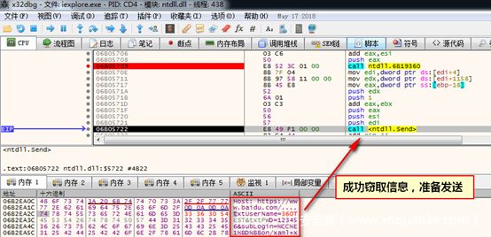 下图为恶意软件最终获得用户所输入的账号密码并即将发送的状态。