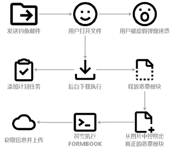 此次钓鱼自然也没有逃出上述的范畴,依然选择了通过邮件发送携带漏洞的文档进行钓鱼。该文档利用了漏洞CVE-2017-11882,此漏洞通过公式编辑器来执行命令行进行攻击,大致流程如下图所示。