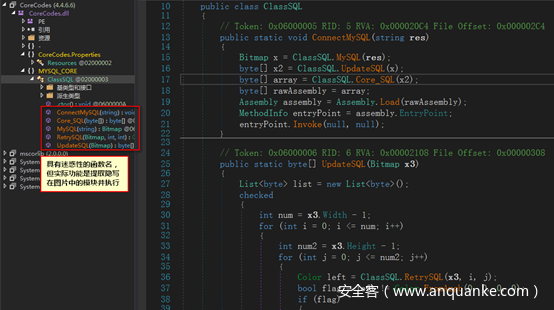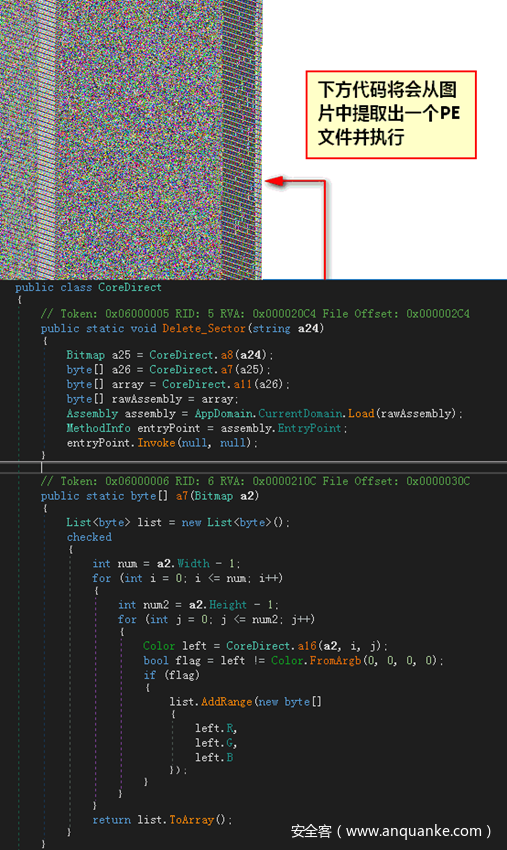 深入分析释放出来的文件发现其通过PNG隐写技术将真正的模块隐藏在自身携带的图片资源中,在运行时从图片中动态提取出恶意模块,然后直接在内存中加载执行。