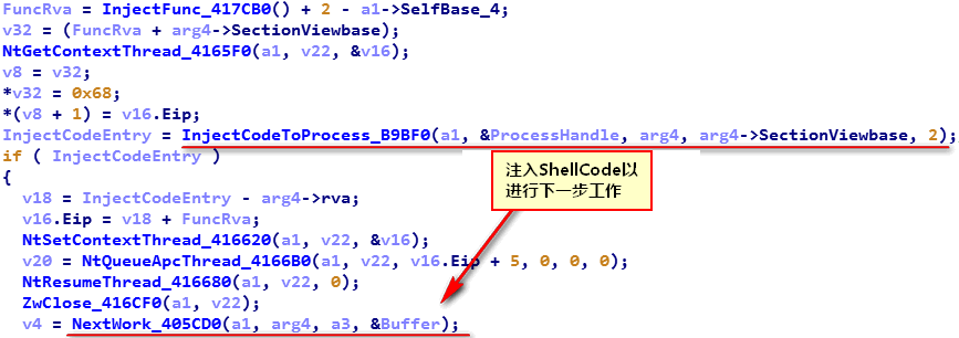 准备工作完成之后,该恶意软件首先向桌面注入ShellCode,然后等待ShellCode执行完毕。