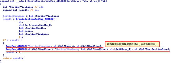 ShellCode的功能是让桌面进程创建一个挂起的子进程,然后将一系列参数共享给恶意模块代码,方便后续进行进程镂空的操作。(值得注意的是每一次所创建的子进程是从预先准备好的列表中随机选取的)。如下图所示,恶意代码使用ShellCode共享出来的参数将自身完整复制到傀儡进程,完成金蝉脱壳。