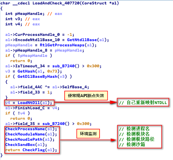 该恶意软件的准备阶段主要是自己在内存中重新映射了一个Ntdll.dll,这样可以使常规API断点失效;紧接着就是一连串的环境检测。