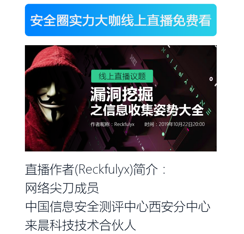 本期直播请到了渗透、挖洞摸爬滚打多年经验丰富的R师傅给大家带来精彩直播,22日晚8点与大家不见不散~