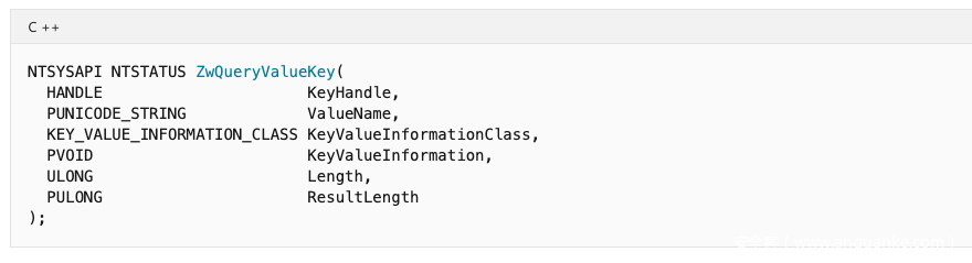 注意: 如果在用户模式下调用此函数,则应使用名称“ NtQueryValueKey ”而不是 “ZwQueryValueKey ”。