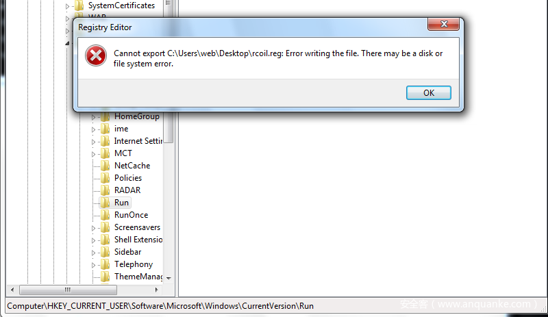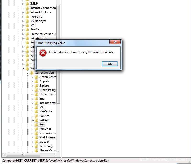 打开注册表进行对此键值进行查询时,则会弹窗提示错误。