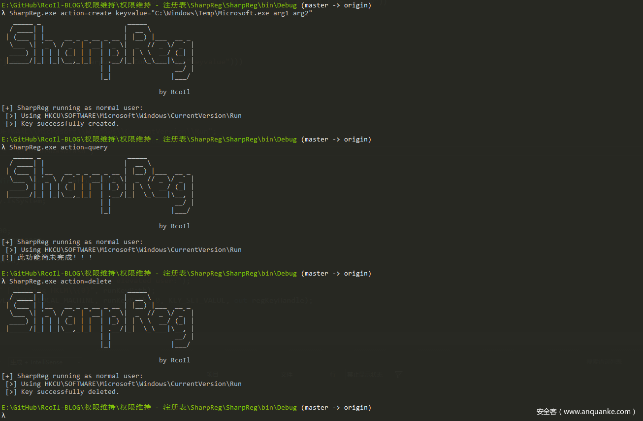 最后,为了方便配合 Cobalt Strike使用,用 C# 重写以上代码(此重写代码多数取之 SharpHide – 之所以只是多数,是因为我在测试时,发现无论创建什么键值,都会提示错误),但是到 NtQueryValueKey 就中断了,因各种调试出错,而且当前互联网中几乎没找到有关于它的任何信息,唯一可借鉴的地方是 NtQueryValueKey.ps1。(希望有人能将下面的代码补全)
