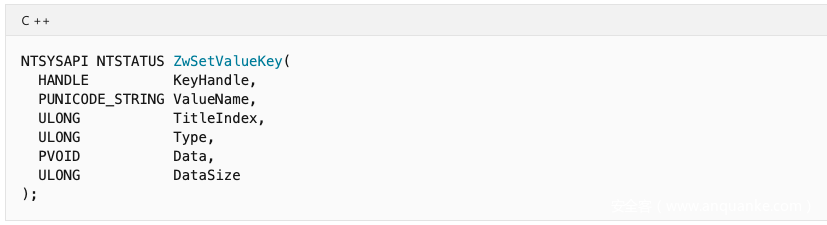 - KeyHandle:处理注册表项以为其写入值条目。该句柄是通过成功调用ZwCreateKey或ZwOpenKey创建的;