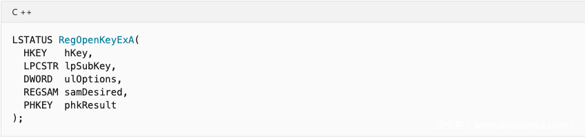 - RegOpenKeyExA – 打开指定的注册表项;