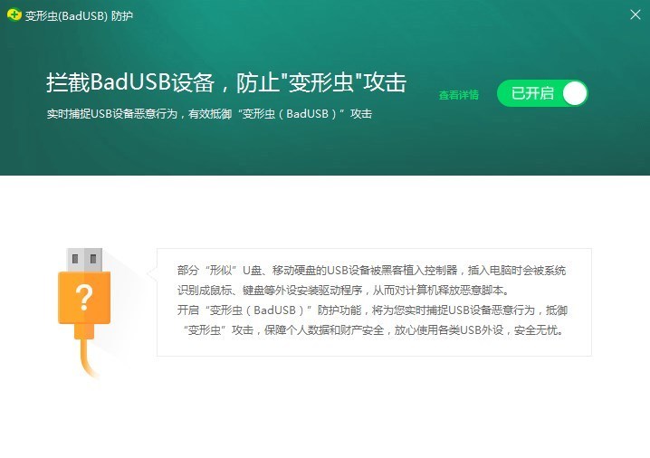 然而,广大用户无须过分担心,依托360安全大脑强大赋能的360安全卫士,已国内首家推出“变形虫(BadUSB)”防护功能,该功能实现了对USB设备插入计算机时的恶意行为扫描和实时捕捉,可及时将USB设备的可疑操作反馈给用户。