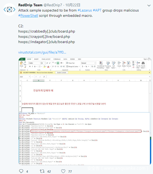 近期,奇安信威胁情报中心红雨滴团队在日常的APT样本追踪中,捕获一例利用心理测验为诱饵的Lazarus攻击样本,该样本通过宏释放PowerShell脚本执行,从而控制受害者计算机。奇安信威胁情报中心通过溯源关联,捕获另一例针对macOS的攻击样本,并在发现此次攻击活动的第一时间通过社交媒体进行预警。