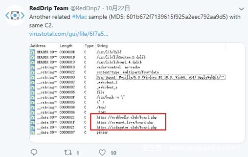 经过关联分析,奇安信威胁情报中心关联到使用相同C2且针对macOS平台的攻击样本,样本基本信息如下:
