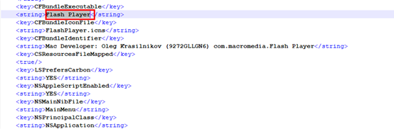 当点击启动app应用程序时,系统会从info.plist中获取应用信息。info.plist文件包括图标,可执行二进制文件名称,加载界面文件等对应用程序的基本描述。该恶意Flash Player通过info.plist执行起来: