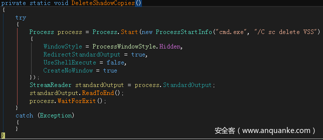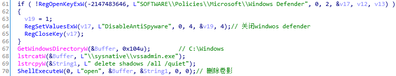 除此以外,FakeParadise为了对抗系统的文件恢复功能,会调用系统命令删除卷影,这一点也与传统的Paradise不同,Paradise家族勒索病毒会删除系统的卷影服务(VSS:Volume Shadow Copy),但并不会删除已存在的卷影(因此可以通过系统的还原点对文件进行恢复)。此外,两家族还存在勒索提示信息风格、加密算法也等诸多不同。