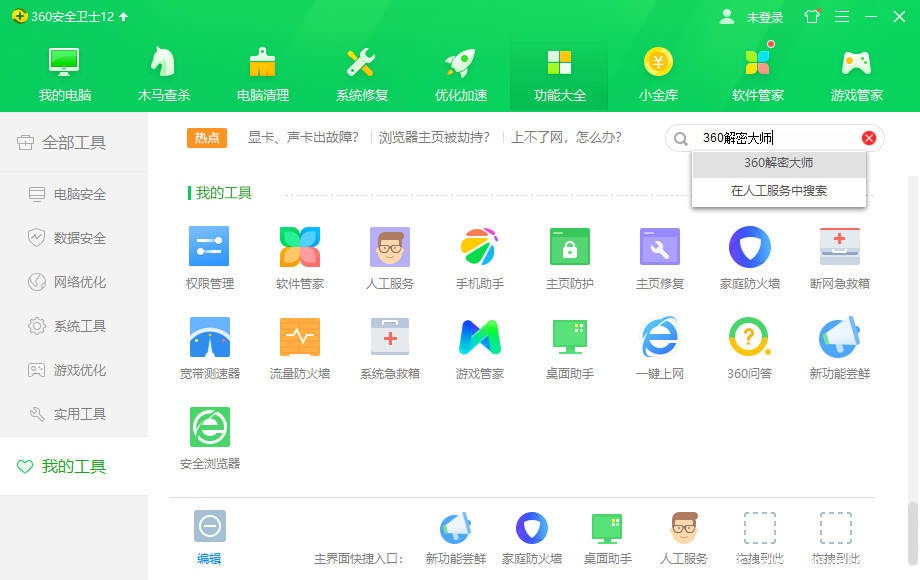 6、中招勒索病毒之后切忌病急乱投医,应立即前往lesuobingdu.360.cn确认所中勒索病毒类型,并在360安全卫士中找到“功能大全”,搜索安装“360解密大师”功能,点击”立即扫描“恢复被加密文件。